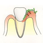 | 3.歯と歯ぐきの間にポケットができます。歯周ポケットといいます。 ここに歯周病菌がたまり、炎症がひどくなり、骨が溶けていきます。
