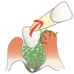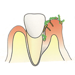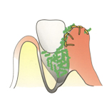 2.炎症によって歯ぐきが腫れ、歯と歯ぐきの間の溝が汚れやすくなり、 カビがさらに奥で炎症を起こします。