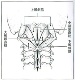 後頭骨隆起の後ろの深部にある、短い首の筋肉群は首の位置の微調整をしています。後頭骨に付くこの筋肉は左右対になっています。