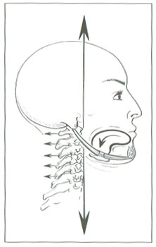 両手の中指を首の後ろにある凹みに置き、親指は顎の下にある口の下の筋肉に置きます。舌がとてもリラックスしてやわらかくなり、口の床にあたる部分もやわらかくなってくるところを想像します。このやわらかさを失わないようにしながら、頭を少し前後に動かします。舌が首から垂れ下がっていると想像してもいいでしょう。舌を少し動かすと、首が反応するのが感じられるでしょう。とくに舌を奥に引っ込めるとよくわかります。