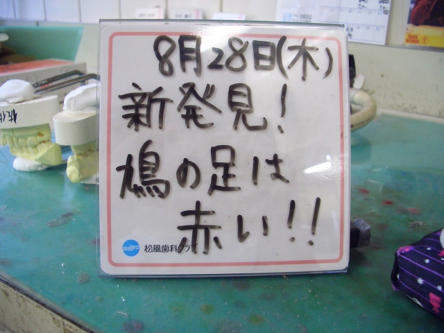 技工室でカレンダー的役割を果しているプレート? ホワイトボードじゃないけど、書いて消せるやつ。 あれに毎日、日にちを書いて一言書くんですが、 25日と26日は絵を描いてみました。 自分でもなかなかの出来だと思うので、載せますよー! 25日たくや 26日もとひろ さあ、私は何を描いたんでしょうね? あまり詳しく書きすぎると検索で引っかかって、ファンに怒られてしまうので書きませんが、 二人ともなかなか特徴を捉えて描けてるなあ。と自画自賛です。 特に秦さ・・・いや、もとひろは、やばいです。似すぎです。 仕事している時にもとひろから目線を感じてました。 おおは・・・いや、たくやも鼻の下辺りがいい味出してます。