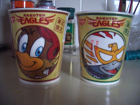去年、仙台に日帰りで医院見学に行ったときにどこかの駅で買った楽天のカップラーメンです。 賞味期限はもう一年くらい過ぎてますが、食べるつもりは無いので大丈夫。観賞用です。