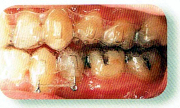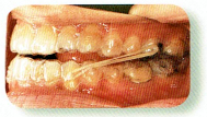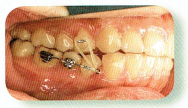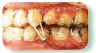 奥歯と犬歯をゴムでつなぎ、犬歯の傾きを治しています。