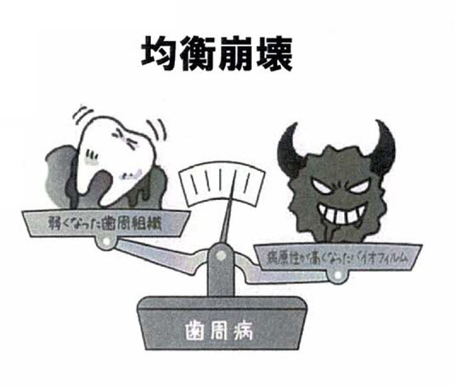 健康なお口では、口腔内細菌(バイオフィルム)と歯周組織の抵抗性のバランスが取れた状態です。
