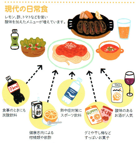 | A12 | 季節を問わずに柑橘類が手に入り、健康のため酸性食品が大人気という現代ならではの食生活が酸蝕症の発症に大きく影響するからです。 私たちの歯を取り巻く酸の環境はここ数十年で様変わりしました。 季節ものだった柑橘類が一年中手に入るようになり、食卓では主菜にレモンやポン酢をかけ、デザートにオレンジやグレープフルーツが並びます。お酒も、果汁たっぷりのチューハイ、ワインが大人気です。 一方、おやつは、コーラ飲料や柑橘ジュースがどこでも手に入ります。グミや梅菓子もとてもすっぱく、私たちの歯が強い酸と出合う機会は、うなぎのぼりです。