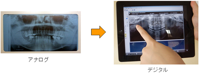 3D画像では、画像を様々な角度から確認することができます。専用ソフトを使って必要な部分を着色したり、連続的な断面画像を確認したり通常では把握できない口腔状態を確認できます。 アナログとデジタルの放射線量比較アナログ方式からデジタル方式に変わり、放射線被爆量が軽減され、より安全に治療することが可能となりました。