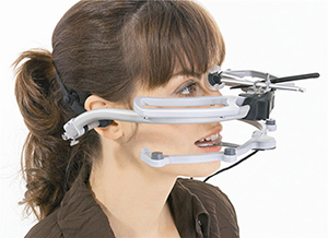 測定の際には、患者様は右図のようにセンサーが装備されたヘッドフレームを装着します。患者様への負担を軽減するよう、軽量でフレームの重量配分も考慮されて設計されています。 当院では下記のような患者様の診療・診断に活用しています。