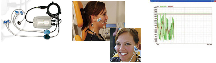 2.EMG(筋電計)筋繊維の活動電位(筋電図)を測定・解析し、咀嚼運動を確認することができます。例えば、入れ歯を新調したあとに実施することで、適切な噛み合わせができているかなどのチェックに用います。データはリアルタイムで記録・視覚化されます。