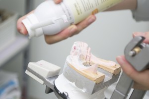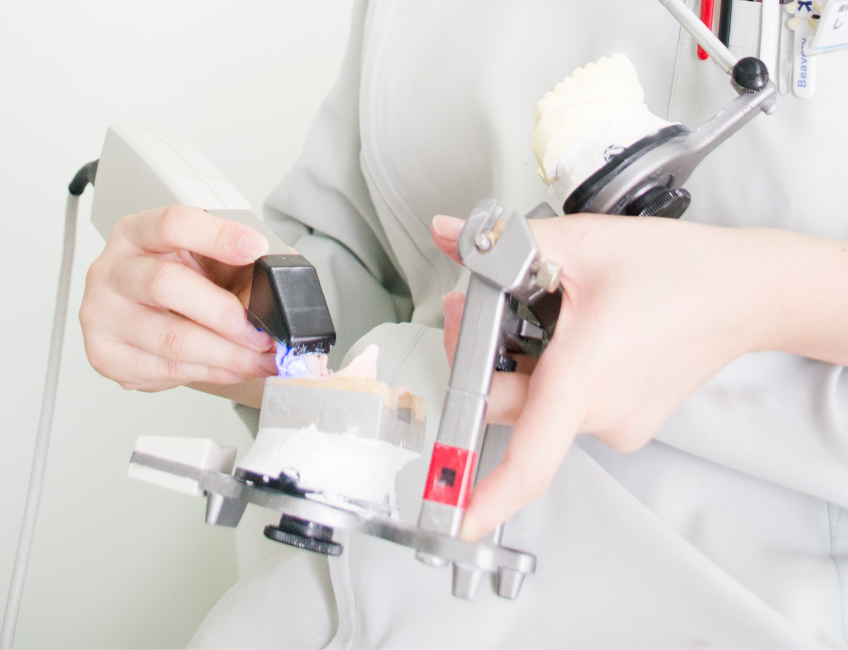 咬合状態を模型上で再現するために、エイブ咬合器を使用し、入れ歯の噛み合わせの確認をしています。 |